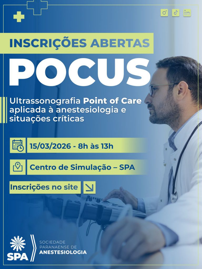 A Sociedade Paranaense de Anestesiologia (SPA) realiza, no dia 15 de março de 2026, o Curso Prático de Ultrassonografia Point-of-Care (POCUS), desenvolvido para anestesiologistas e residentes que desejam ir além do básico e conquistar segurança real no uso do ultrassom à beira-leito.